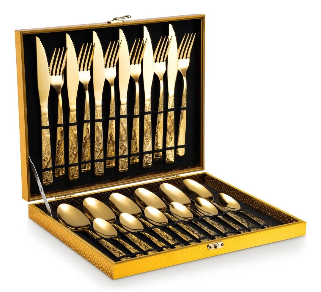 Cada peça é revestida com acabamento GOLD, oferecendo brilho único e sofisticação à sua mesa.