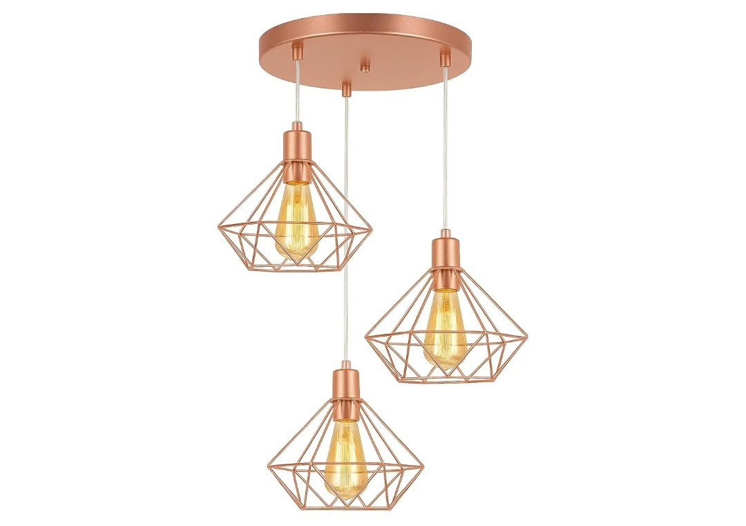 DESIGN MODERNO: Luminária pendente triplo com estrutura aramada em formato diamante, acabamento rose gold, perfeito para decoração industrial e contemporânea